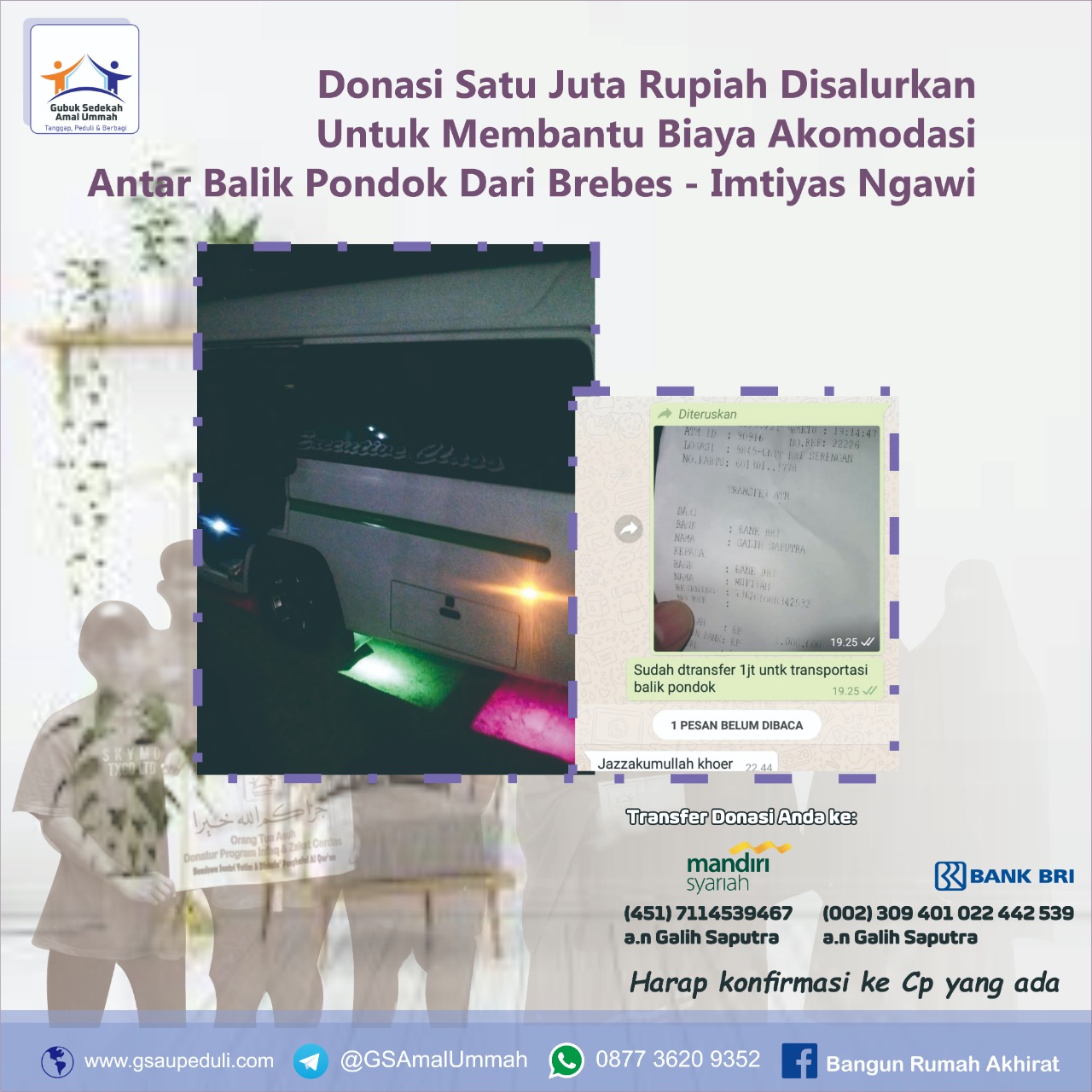 Alhamdulillah donasi sebesar Rp 1.000.000,- (Satu Juta Rupiah) telah disalurkan untuk membantu biaya akomodasi transport balik pondok dari Brebes ke Imtiyas Ngawi.