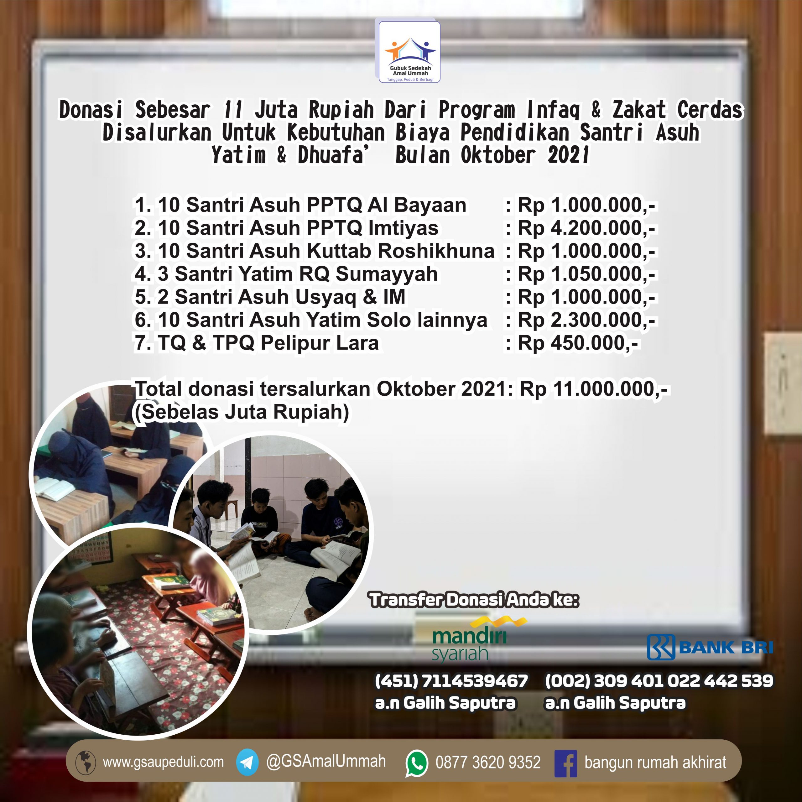 Total donasi yang tersalurkan untuk biaya pendidikan bulan Oktober 2021: Rp 11.000.000,- (Sebelas Juta Rupiah).